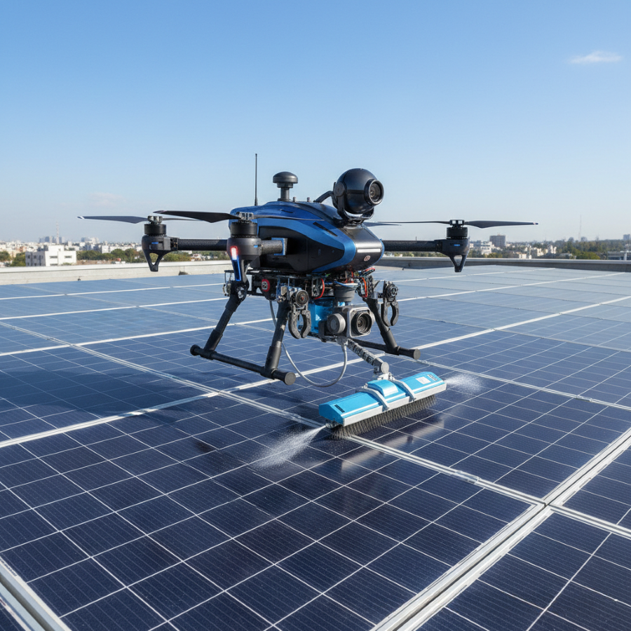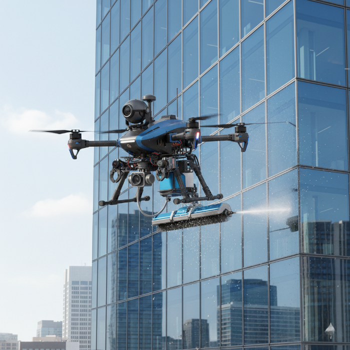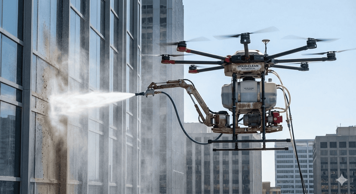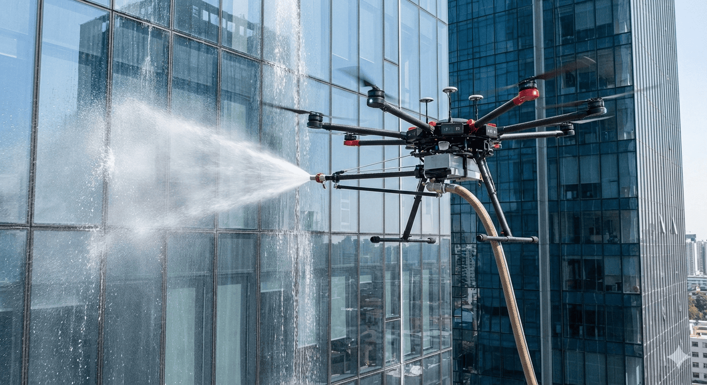 High-rise cleaning using professional drones — no ropes, no scaffolding.